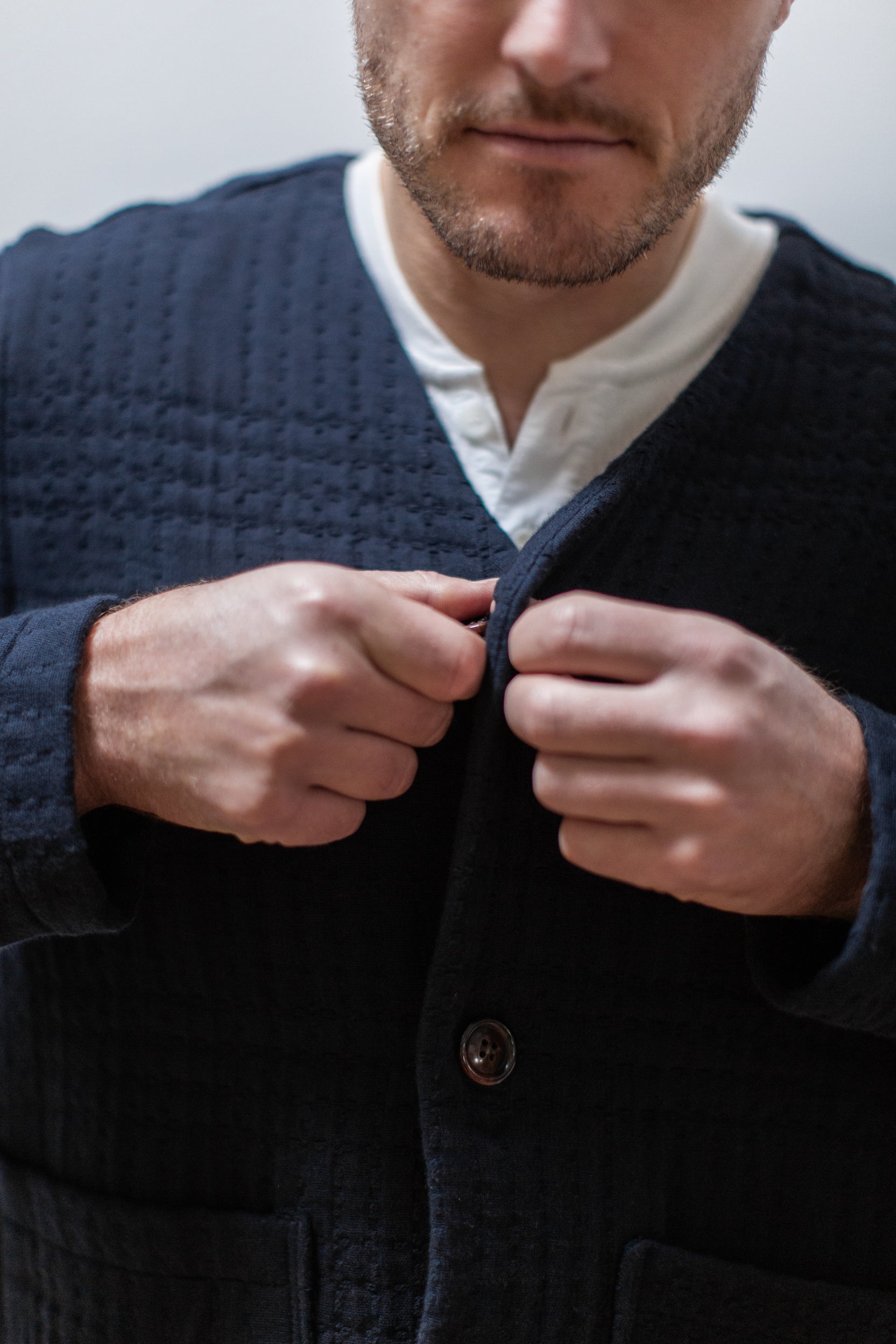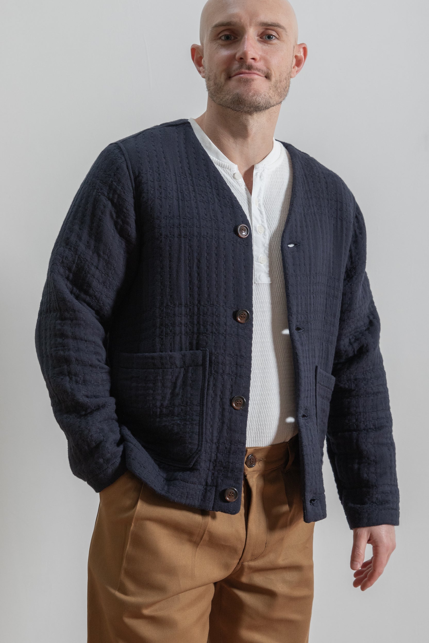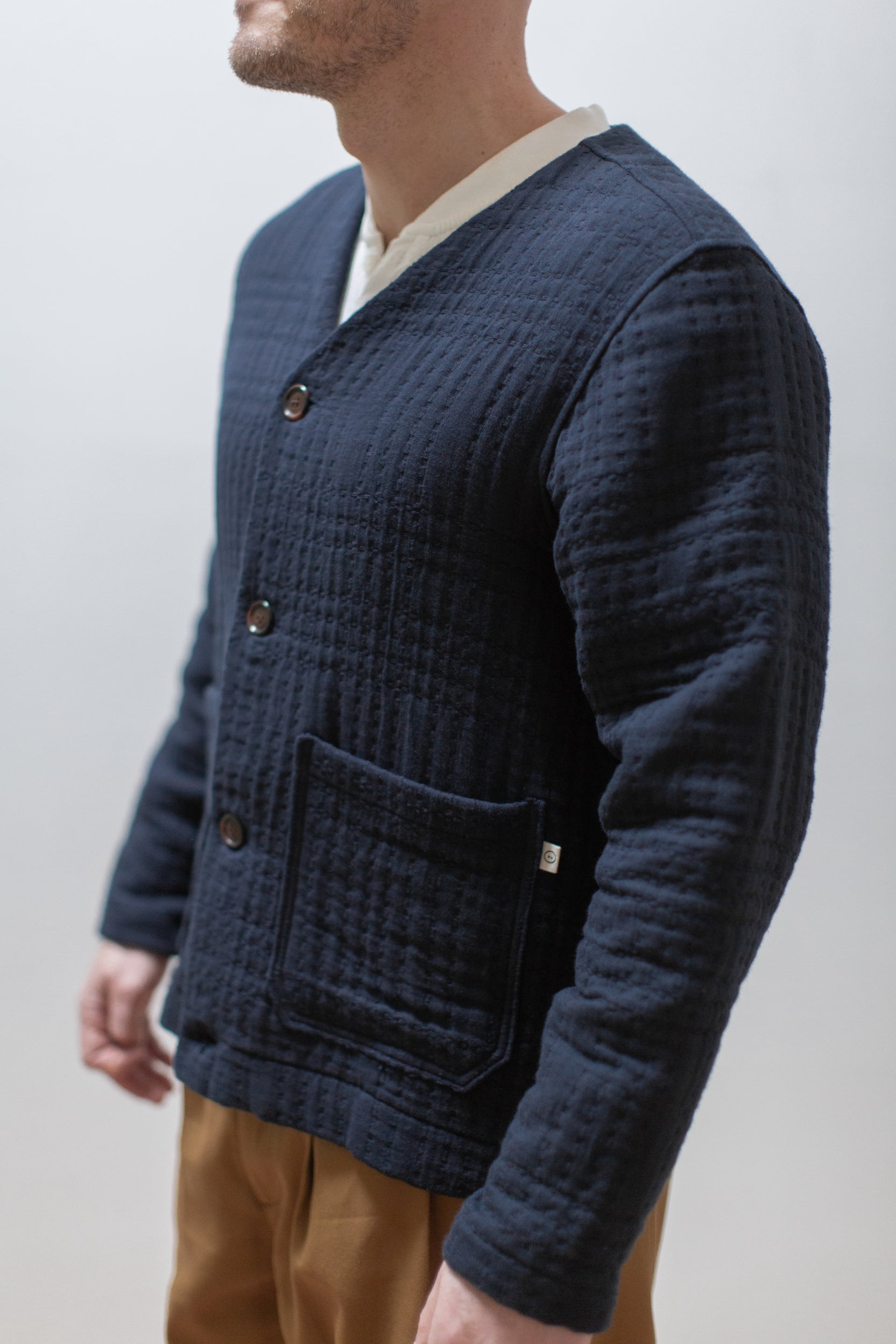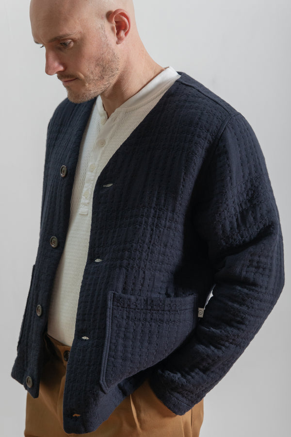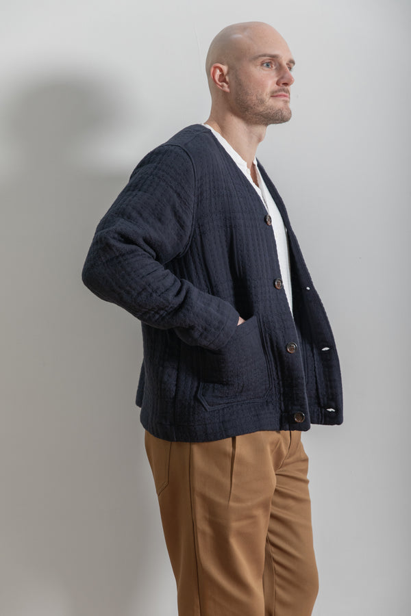 This jacquard cardigan offers a relaxed fit with a collarless design and button-front closure, with patch pockets, perfect for layering in cooler weather. Crafted from jacquard fabric with a subtle quilted texture and providing lightweight warmth. A versatile piece ideal for casual or smart-casual wear. Its classic style ensures easy pairing with various outfits for everyday comfort and style.