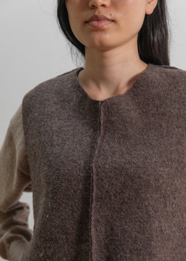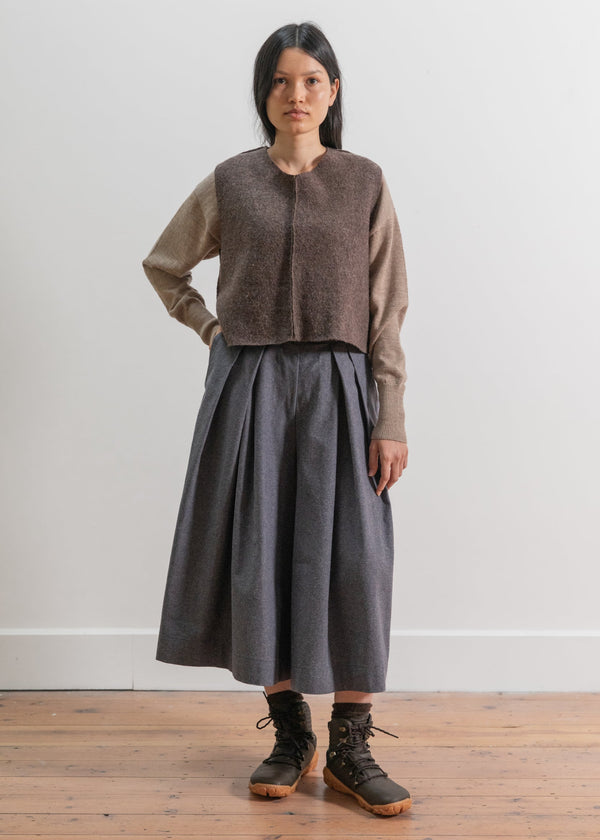 The Loden Wool Tank Top offers a minimalist design, crafted from 100% pure wool for natural warmth and breathability. Its boxy silhouette is complemented by visible seams and raw edges, lending a subtle handcrafted touch that enhances its understated appeal. This tank is perfect for layering, providing cozy comfort while maintaining a relaxed, modern look.