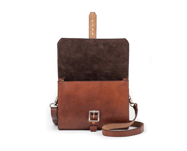 Crafted in Oak Bark tanned Devon leather, this bag is spacious enough for an A6 notebook, keys, mobile and wallet. 13.5 x 18.5 x 5cm.