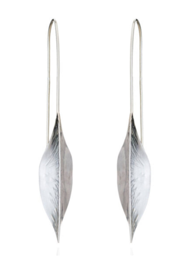 Organic cupped leaf earrings with a beautiful scored textural detail, simply hung on long fine silver wire.