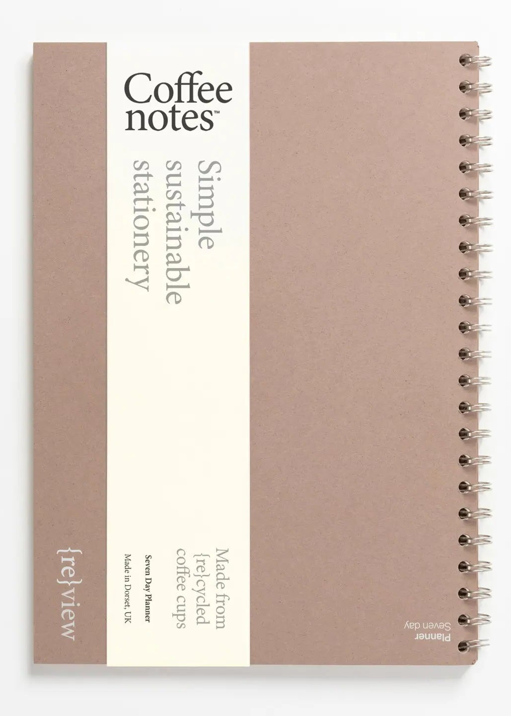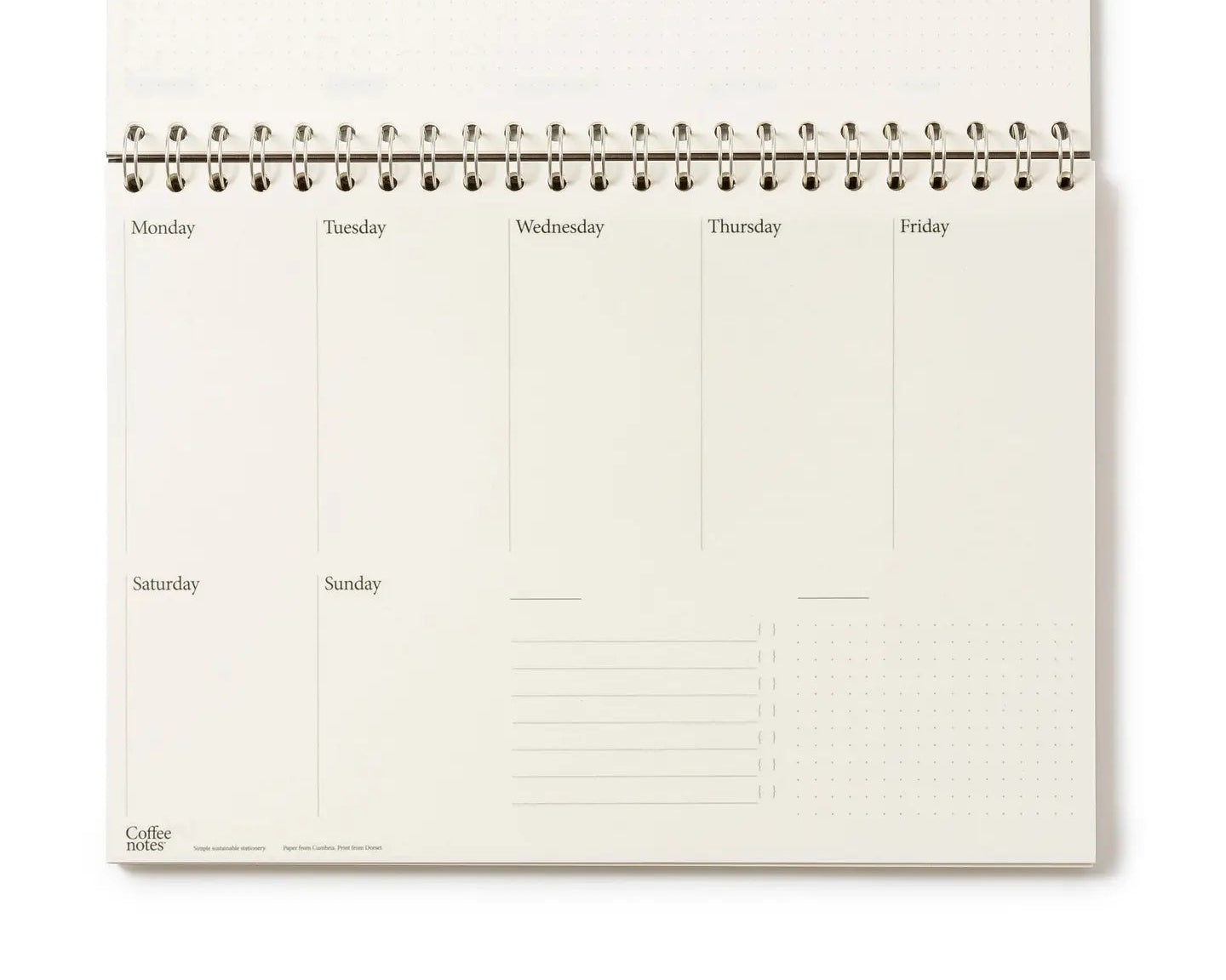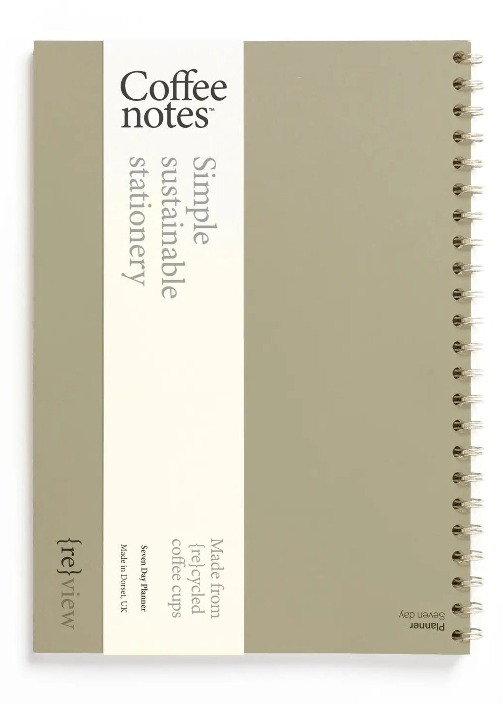 This undated Weekly Planner has a simple minimal layout with areas for daily events and flexible spaces for to-do lists and notes. Made from {re}cycled coffee cup paper and {re}purposed nut waste, it is part of the Nut Collection.