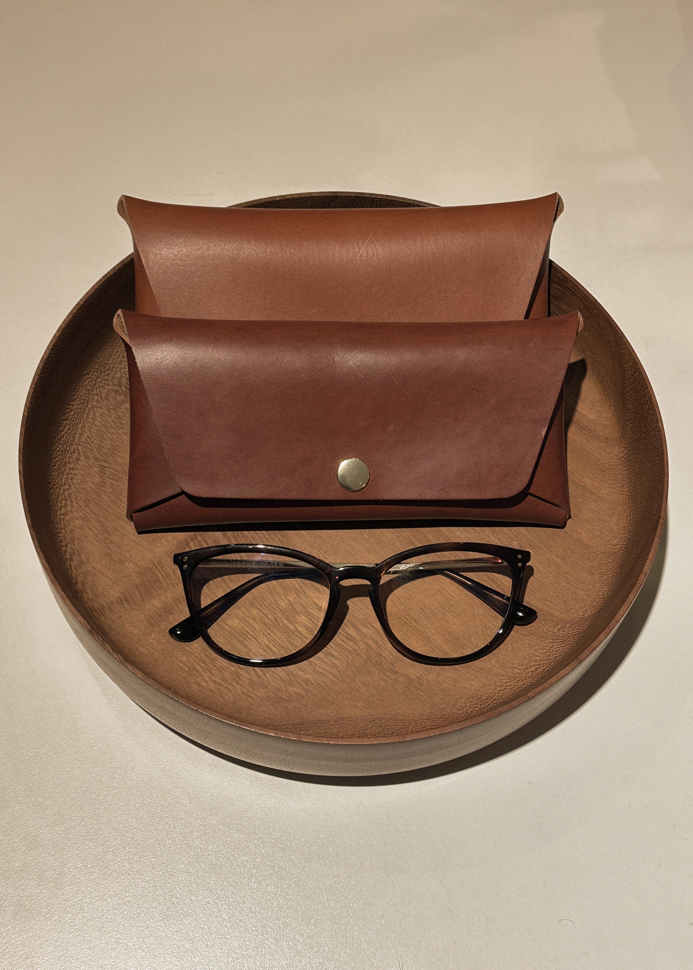 Contemporary, stylish and minimalist. This handmade glasses case is the perfect home for your eyewear when not perched on your face! Made from a single piece of full grain, vegetable tanned Italian leather, featuring a raw edge detail, and finished with a solid brass snap closure, this ingenious design folds together without so much as a stitch!