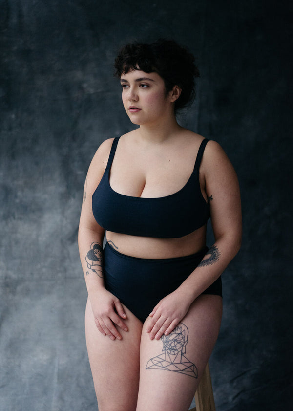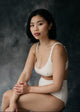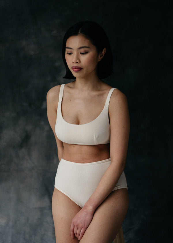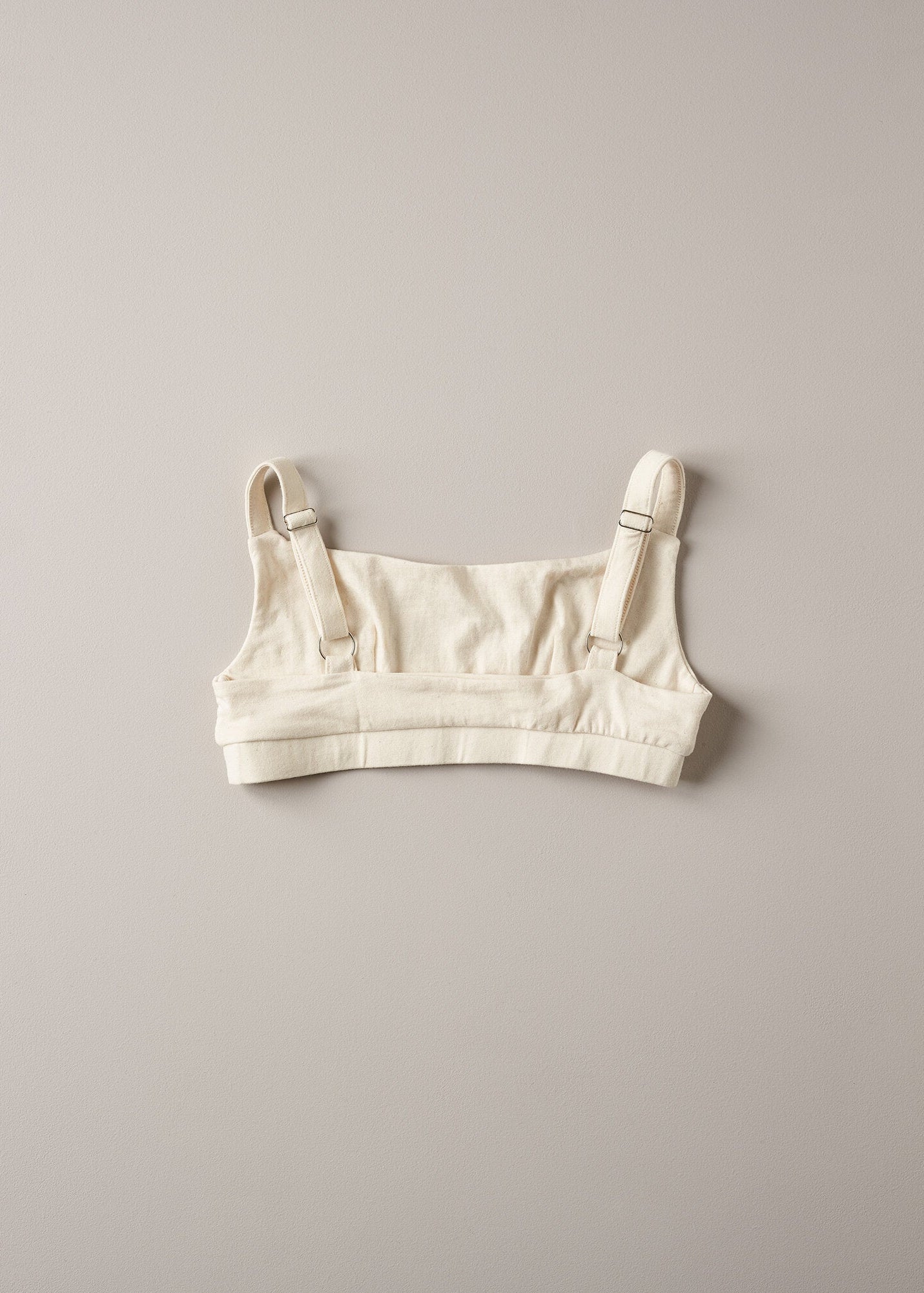 Soft organic cotton full crop top in un-dyed ecru with covered adjustable straps and underband for extra comfort. Darts on the bust for shaping. A more supportive style of our crop top with wider straps and fuller coverage at the sides and front.
