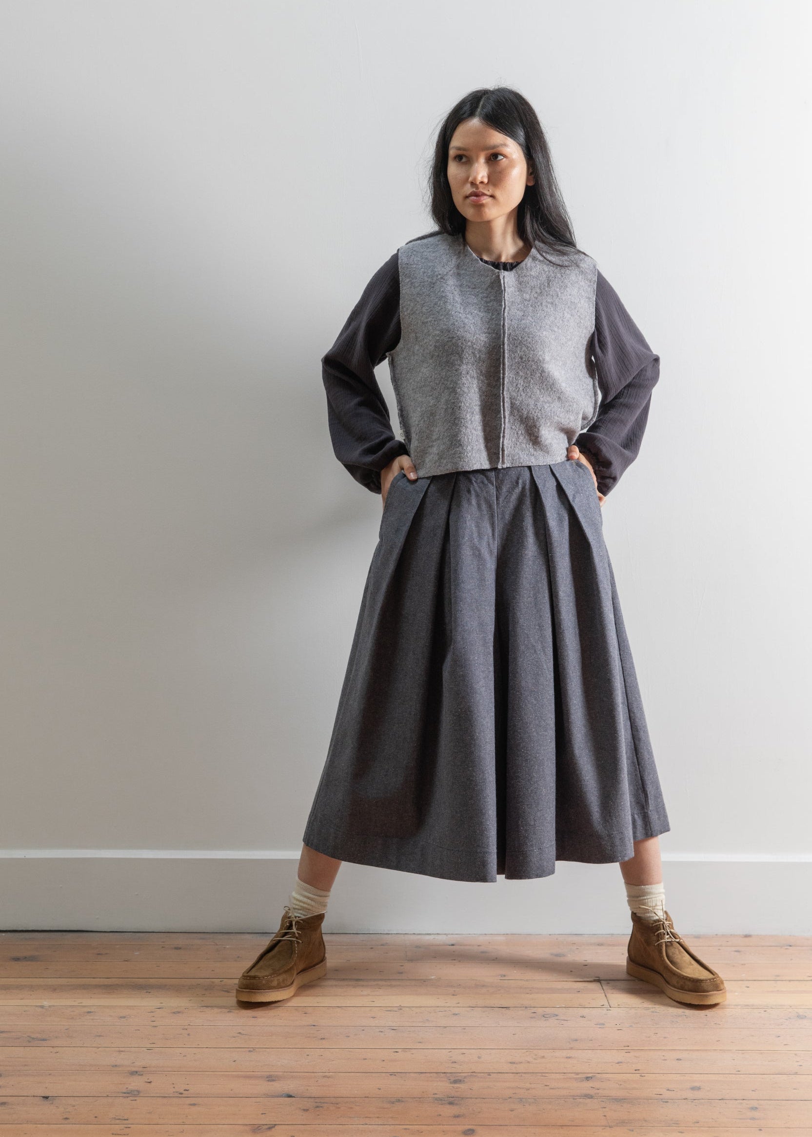 The Loden Wool Tank Top offers a minimalist design, crafted from 100% pure wool for natural warmth and breathability. Its boxy silhouette is complemented by visible seams and raw edges, lending a subtle handcrafted touch that enhances its understated appeal. This tank is perfect for layering, providing cozy comfort while maintaining a relaxed, modern look.